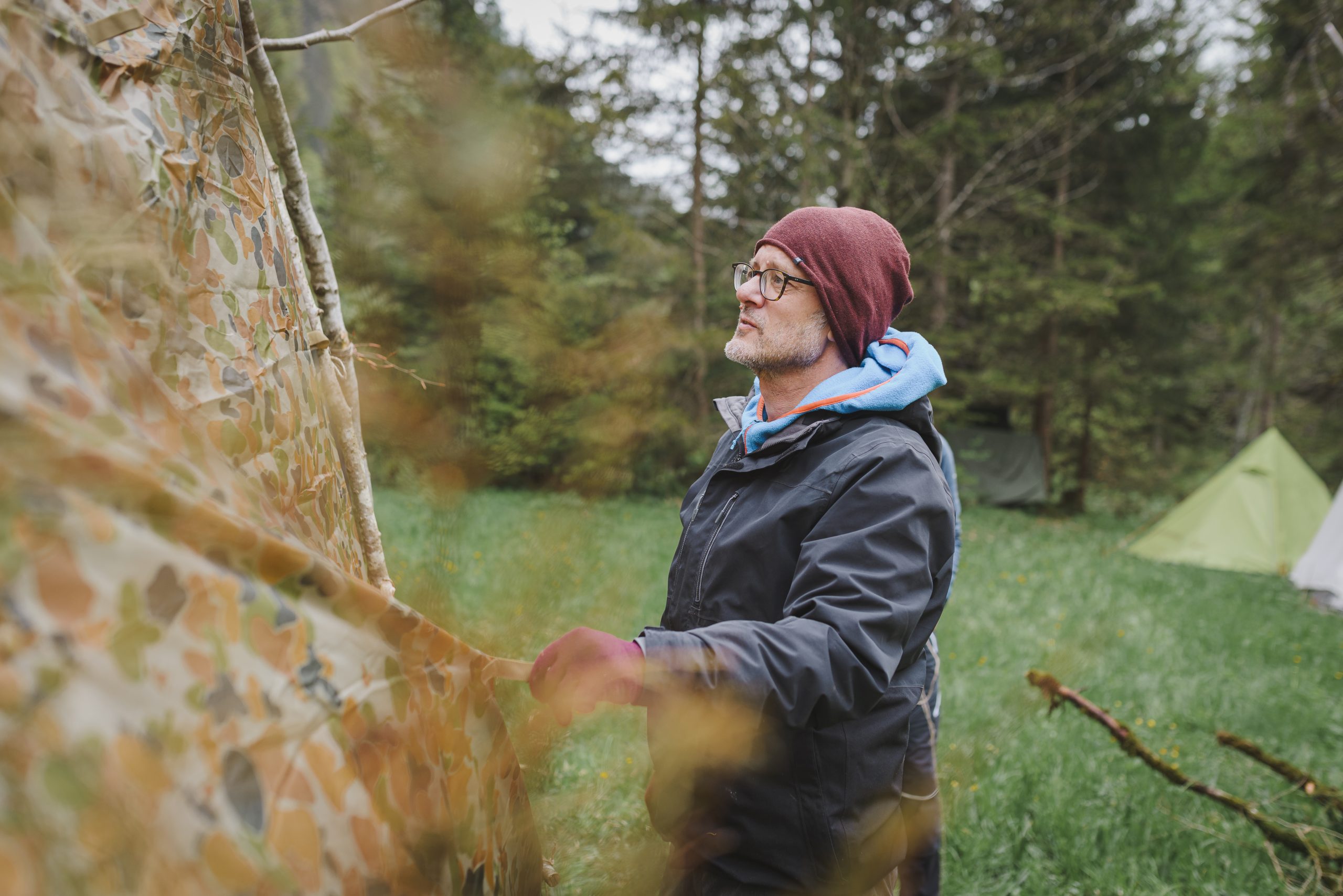 Wir verwenden eine Mischung aus natürlichen Materialien wie Ästen und Überlebensausrüstung, beispielsweise Planen und Naturseile.